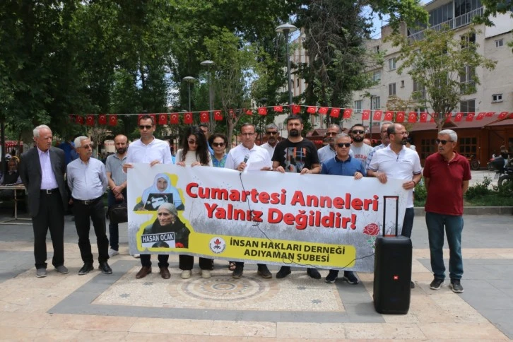 İnsan Hakları Derneği Adıyaman Şubesi, Adıyaman Demokrasi parkı önünde basın açıklaması düzenledi İnsan Hakları Derneği Adıyaman Şubesi adına açıklamalarda bulunan İHD üyesi Bülent Çınar, “Bugün burada, 1000. kez aynı derin acı ve aynı ısrarla bir araya geliyoruz. 1000 hafta. Yani 7000 gün, 229 ay… Yani arayışla geçen bir ömür. Biz Cumartesi Anneleri, İnsanlarıyız. Anneyiz, babayız, eşiz, kardeşiz, evladız, yeğeniz, torunuz. Yani sizler gibiyiz. Ama aslında bir farkımız var sizden. Bizim kalbimizde aynı derin yara sızlıyor; sevdiklerimizin mezarlarına bile sahip olamamanın tarifsiz acısı. Devletin güvenlik güçleri tarafından gözaltına alınan sevdiklerimizden bir daha haber alamadık.
