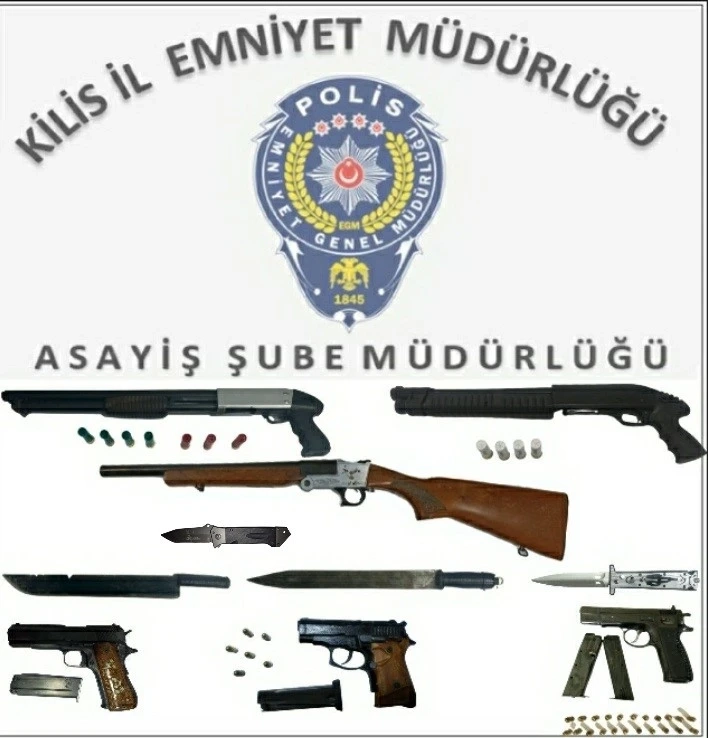 Kilis Cumhuriyet Başsavcılığı koordinesinde, Kilis İl Emniyet Müdürlüğü Asayiş Şube Müdürlüğü ekiplerince ilimizde meydana gelen asayiş olaylarının faillerinin tespiti ve yakalamalarına yönelik yapılan çalışmalarda çok sayıda ruhsatsız silah, kesici alet ve fişek ele geçirildi.