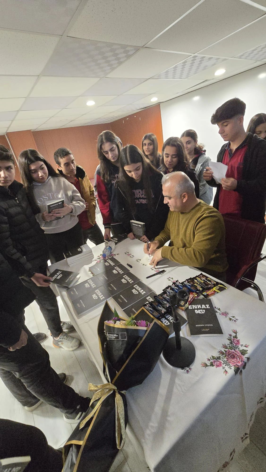 Öğrencilerin yoğun ilgi gösterdiği konferasın sonunda Eğitimci Yazar Mustafa Coşkun öğrencilere ENKAZ 04.17 romanını imzaladı.