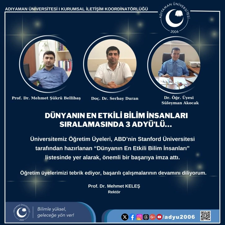 Bu veriler ışığında “Dünyanın En Etkili Bilim İnsanları Listesi”ne “Yıllık Etki” alanında üniversitemizden Prof. Dr. Mehmet Şükrü Bellibaş (Eğitim), Doç. Dr. Serbay Duran (Matematik) ve Dr. Öğretim Üyesi Süleyman Akocak (Eczacılık) adını yazdırdı.