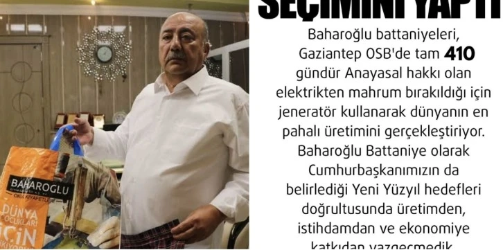 Baharoğlu, Cumhurbaşkanı Recep Tayyip Erdoğan’ın belirlediği yeni yüzyıl hedefleri doğrultusunda elektrikten mahrum bırakıldığını, jeneratörle bile olsa üretime devam ettiklerini ifade ederek, Dünyanın en pahalı üretimini yaptığını söyledi.