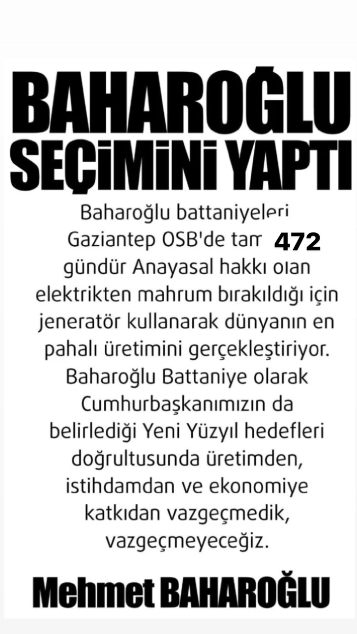 Baharoğlu, Cumhurbaşkanı Recep Tayyip Erdoğan’ın belirlediği yeni yüzyıl hedefleri doğrultusunda elektrikten mahrum bırakıldığını, jeneratörle bile olsa üretime devam ettiklerini ifade ederek, Dünyanın en pahalı üretimini yaptığını söyledi.