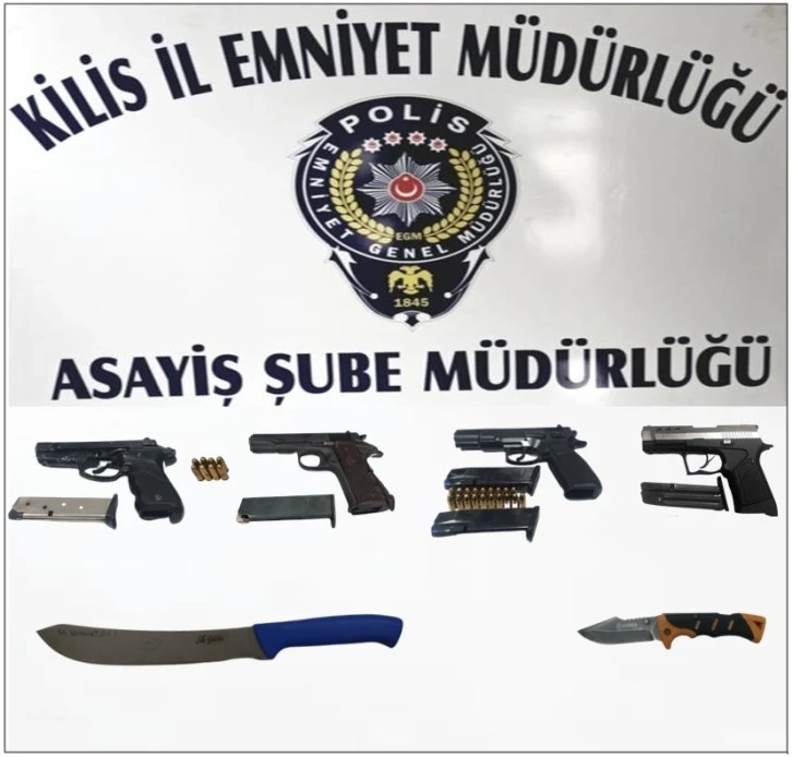 Kilis İl Emniyet Müdürlüğü Asayiş Şube Müdürlüğü ekiplerince yapılan çalışmalar sonucu ilimizde meydana gelen yağma olayında 1 adet bulundurma ruhsatlı tabanca 19 adet fişek 2 adet şarjör ile 1 adet kurusıkı tabanca, 6136 SKM olayında 1 adet ruhsatsız tabanca 8 adet fişek, yapılan uygulamalarda da 1 adet kurusıkı tabanca ile 2 adet kesici alet ele geçirilmiş, şahıslar hakkında gerekli adli/idari idari işlemler uygulandı.