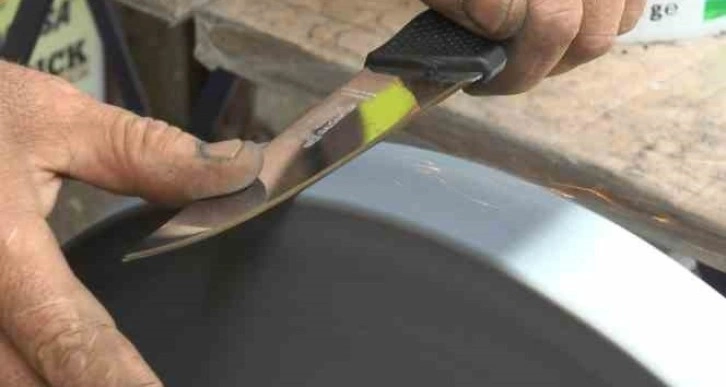 Bıçaklara uygulanan yoğun ve meşakkatli işlemi anlatan Koyuncular, “Bıçakların ağzı kalın olduğu için önce taşlama yapıyoruz. Taşlama ile biraz inceltmeye çalışıyoruz, inceltme kısmından sonra keçe(zımpara) dediğimiz malzeme ile zımparalıyoruz. Onları yaptıktan sonra ağzı tellenen bıçakları bileme taşına vurarak ucunda kalan telleri alıyoruz ve bıçaklarımız keskinleşerek kesime hazır oluyor” ifadelerini kullandı.