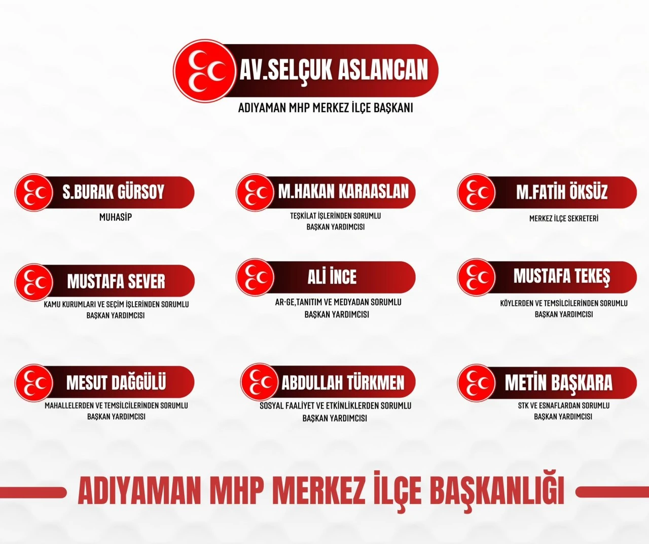 MHP Adıyaman Merkez İlçe Başkanlığı’nda sonraki kongreye kadar görev yapacak olan Divan Kurulu Merkez İlçe Başkanı Avukat Selçuk Aslancan’ın sosyal medya hesabından yaptığı paylaşımla duyuruldu.