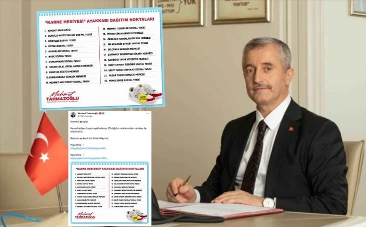 Sosyal medya hesabı üzerinden paylaşımda bulunan Tahmazoğlu, ‘’Kıymetli gençler, Karne hediyeniz spor ayakkabınızı, 22 dağıtım noktamızdan randevu ile alabilirsiniz’’ dedi.