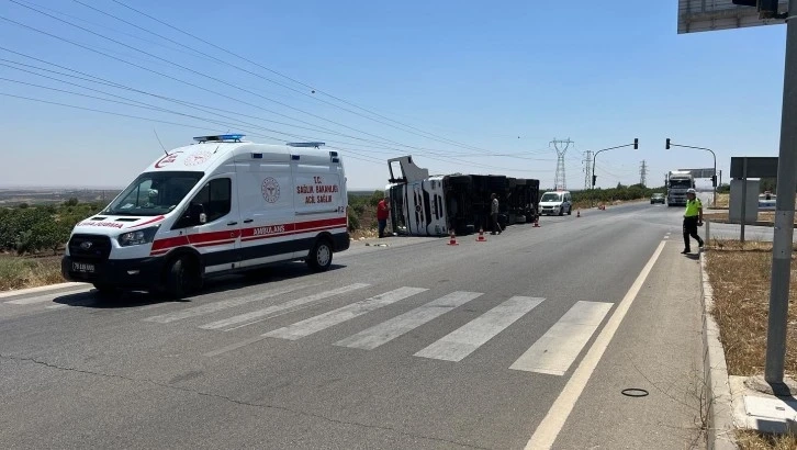 Kilis'te virajı alamayan kumaş yüklü bir tır Organize Sanayi Kavşağında yan yattı.