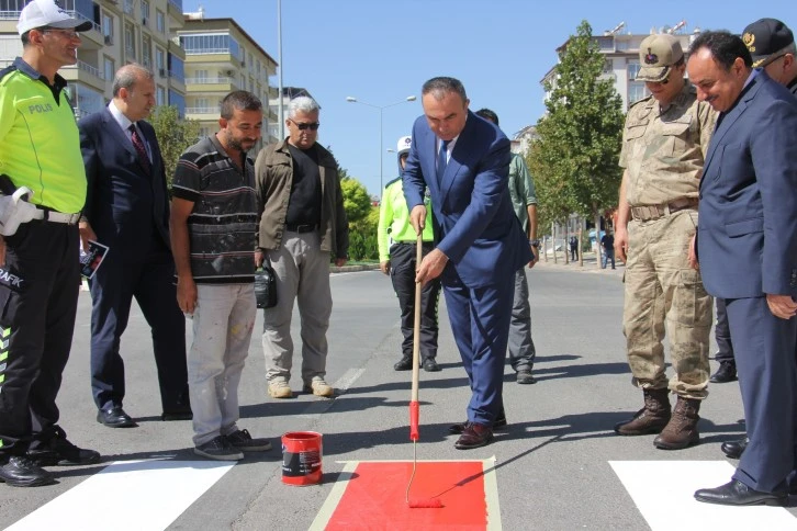 Yapılan konuşmanın ardından Vali Soytürk yaya geçidinde şerit boyama yaparak Yayalar Kırmızı Çizgimiz mesajı verdi. Öğrencilerimiz ellerinde bayraklarla yaya geçidinden geçti. Ardından sürücü ve yayalara yaya önceliğiyle ilgili broşürler dağıtılarak bilgilendirme yapıldı.