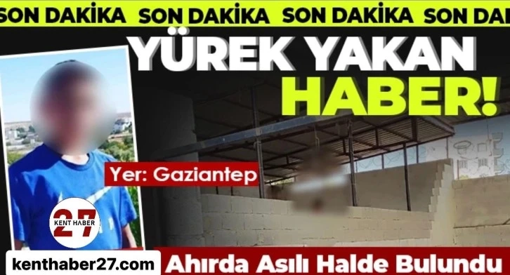 www.kenthaber27.com  haber merkezine gelen son dakika bilgilerine göre, Gaziantep'in Nizip ilçesi  Yeşilevler mahallesi Kocatepe yolu üzerinde bu akşam 19:00 sularında 16 yaşındaki İ.S.  isimli çocuk hayvan ahırında çatı koluna iple asılı vaziyette ölü olarak yakınları tarafından bulundu. Olay yerine çağrılan polis, sağlık ekipleri ve olay yeri inceleme ekiplerinin yaptığı araştırma sonrasında İ.S.'nin cansız bedeni otopsi yapılmak üzere Adli Tıp Kurumu morguna kaldırdı. Olayla ilgili şüpheli ölüm soruşturması başlatıldığı öğrenildi.