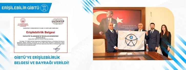 Gaziantep İslam Bilim ve Teknoloji Üniversitesi’ne (GİBTÜ) engelli bireylerin toplumsal konumlarını güçlendirmek ve daha aktif bir şekilde hayata katılımlarını sağlamak amacıyla Üniversite içerisindeki tüm yapılar erişilebilir hale getirilmesi nedeniyle Gaziantep Valiliği bünyesinde oluşturulan Erişilebilirlik İzleme ve Denetleme Komisyonu tarafından “Erişilebilirlik Belgesi” ve “Erişilebilirlik Bayrağı” verildi.