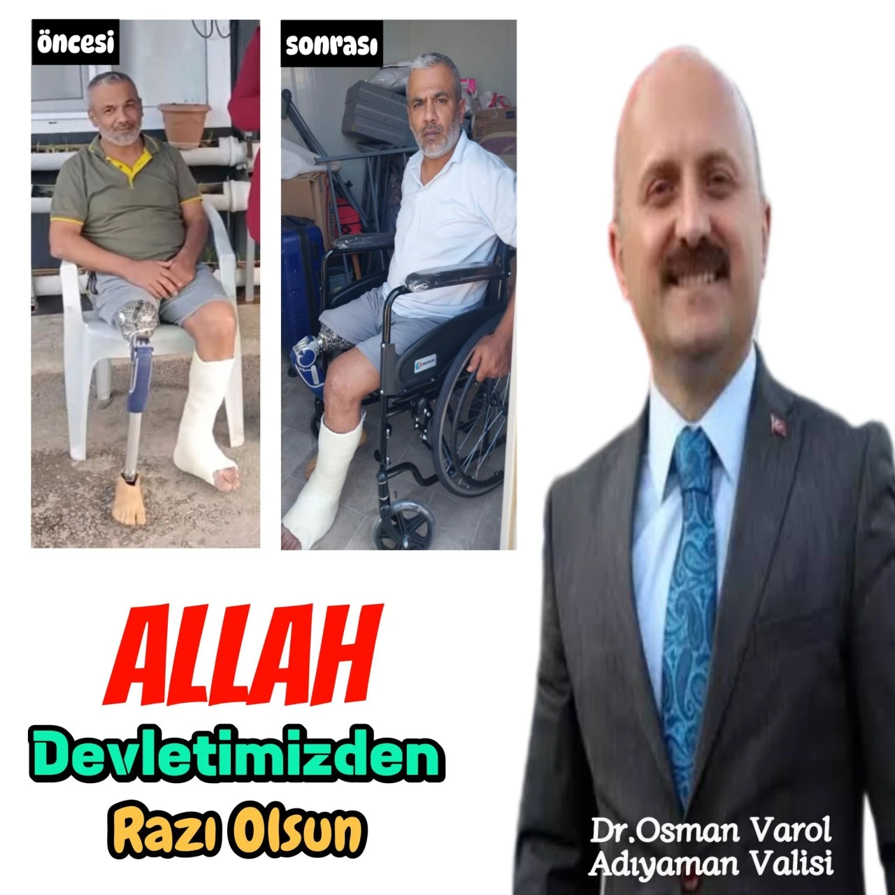 Dün haberini yaptığımız; Adıyaman Altınşehir Mahallesi K-1 deprem konteynırında 13 yaşındaki çocuğuyla birlikte hayata tutunmaya çalışan Yunus Beyin, depremde eşini, bir çocuğunu ve ayağını kaybetttiğini, bu nedenle kendi pozisyonuna uygun bir iş ve tekerlekli sandalye istediğini kamuoyuna servis etmemiz üzerine, Adıyaman Valisi Doktor Osman Varol’un, mağdur vatandaşımıza bir adet akülü araba verdiğini büyük bir sevinçle öğrendik. Konuyu Sayın Valimize ileten, başta Vali Yardımcımız Sayın Mehmet Ali Uzun’a ve Sosyal Yardımlaşma ve Dayanışma Vakfı Müdürü Sayın Mehmet Şimşek’e bilhassa teşekkür eder, görevlerinde muvaffakiyetler dileriz.