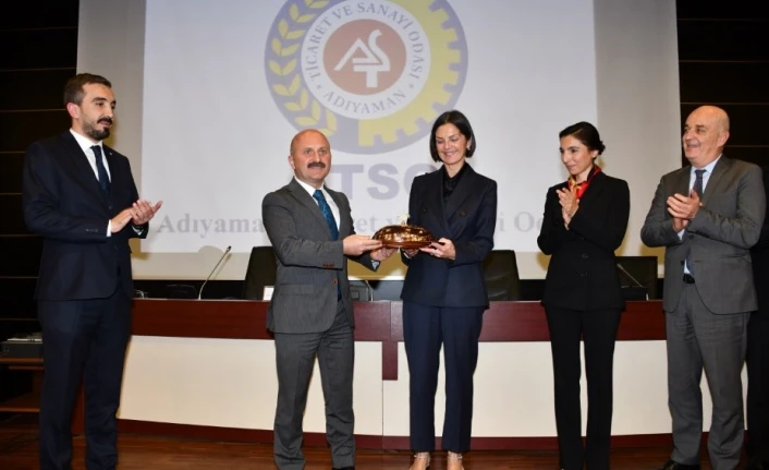 Toplantı soru-cevap bölümüyle devam ederken toplantı sonunda ATSO Başkanı Mehmet Torunoğlu ve Adıyaman Valisi Dr. Osman Varol, Merkez Bankası Başkanı Dr. Hafize Gaye Erkan’a ve beraberindeki heyete hediye takdiminde bulundu.