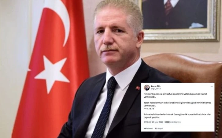 Gaziantep Valisi Davut Gül, sosyal medya hesabı üzerinden yaptığı açıklamada, ‘’Kimlik ihtiyaçlarınız için Nüfus idarelerimiz vatandaşlarımıza hizmet vermektedir. Yatan hastalarımızın oy kullanabilmesi için evde sağlık birimimiz hizmet vermektedir.