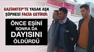 Gaziantep'te bir şahıs, dayısıyla yasak aşk yaşadığını iddia ettiği eşi Sakine Solmaz'ı boğazını bıçakla keserek öldürdükten sonra dayısını da silahla öldürdü. Yaşanan çifte cinayetin ardından kaçan katil zanlısı, Asayiş Şube Müdürlüğü Cinayet Büro Amirliği ekiplerince yakalandı.