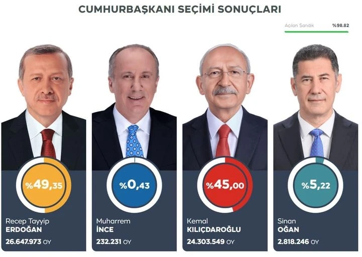 Kesin olmayan geçici sonuçlara göre, Sayın Recep Tayyip Erdoğan’ın yüzde 49,51, Sayın Kemal Kılıçdaroğlu’nun yüzde 44,88, Sayın Sinan Oğan’ın yüzde 5,17 Sayın Muharrem İnce’nin yüzde 0,44 oy aldığı görülmüştür.